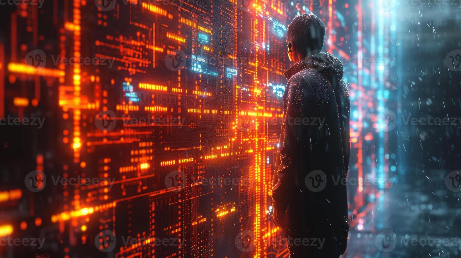 A man in front of a hightech screen in a futuristic setting Pro Photo