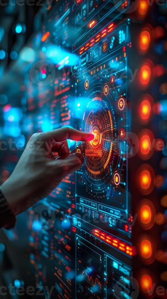 The image shows a futuristic interface where a hand interacts with advanced touchscreen technology Pro Photo