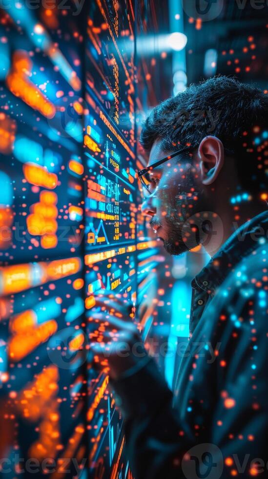 A man in glasses looking at a computer screen in a server room Pro Photo