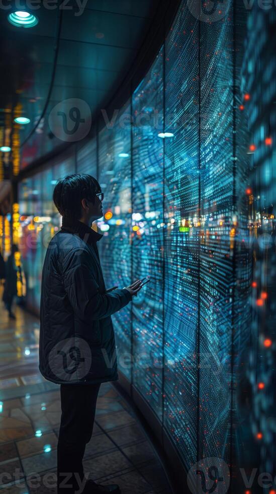 A man is standing in front of a large screen, observing it intently Pro Photo