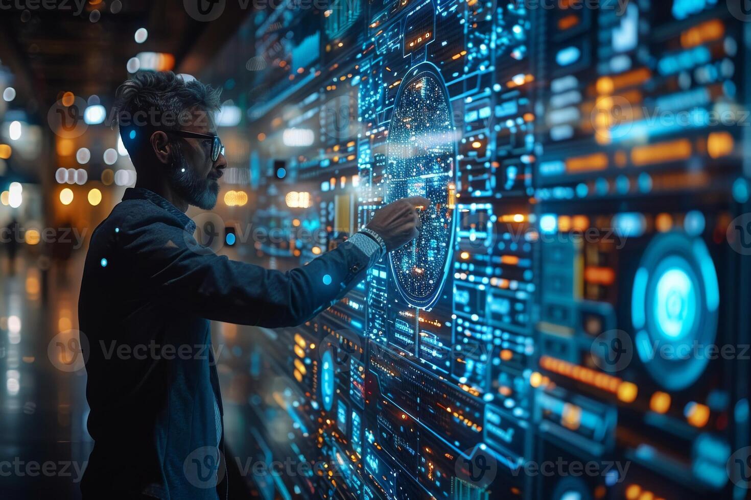 A man is standing in front of a large screen displaying various keywords Pro Photo