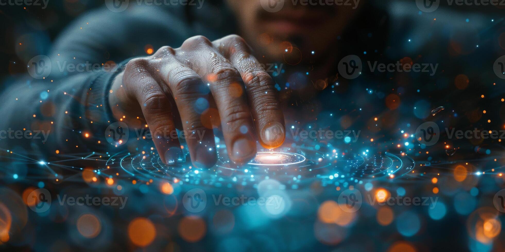 A man is interacting with a hightech display by pushing a button Pro Photo