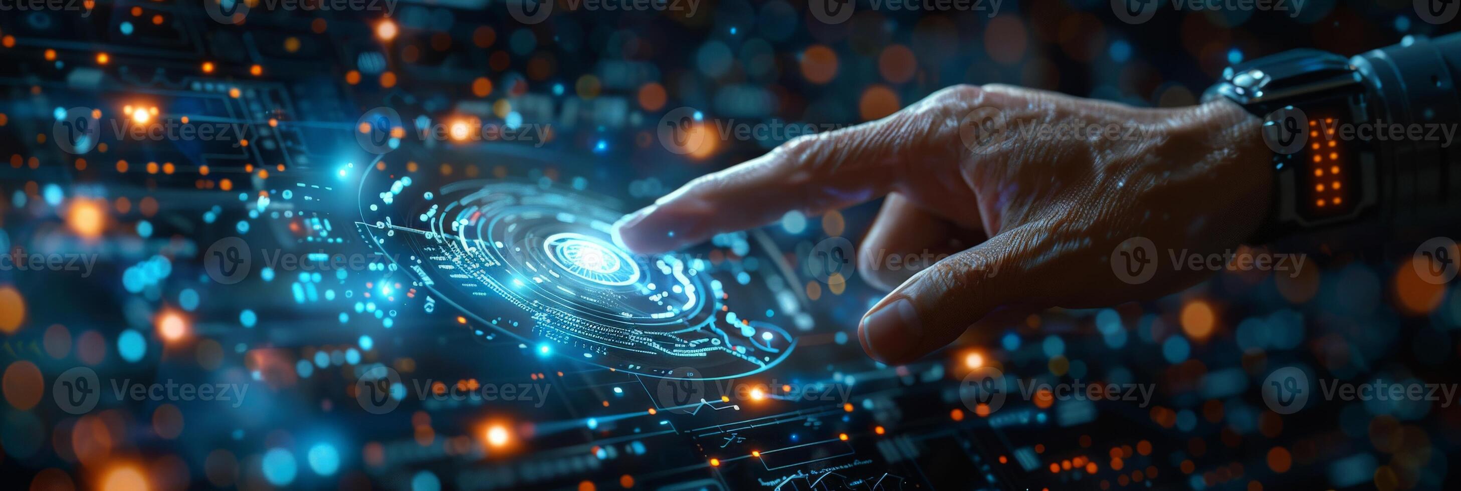 Hand interacts with button on futuristic hightech screen Pro Photo