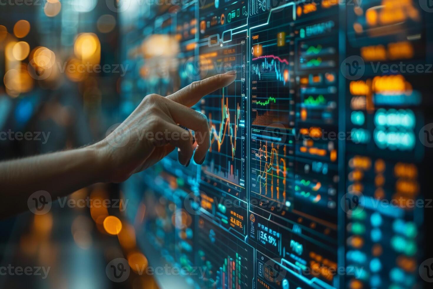 A person is pointing at a computer screen displaying graphs Pro Photo