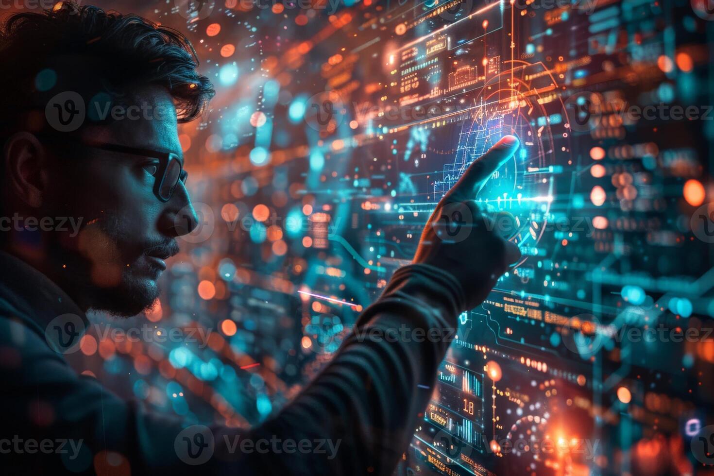 A man with glasses points at a computer screen in a dark room at midnight Pro Photo
