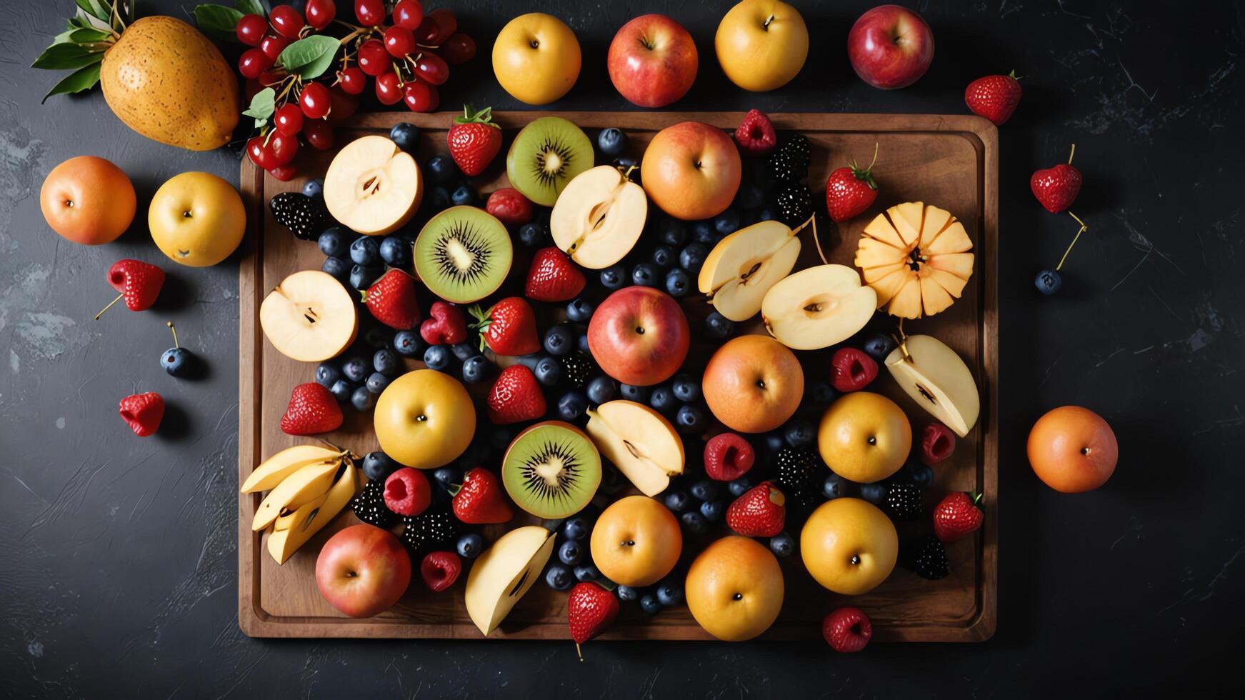fruit on a black table, design background object on the table, random fruit frame border Free Photo