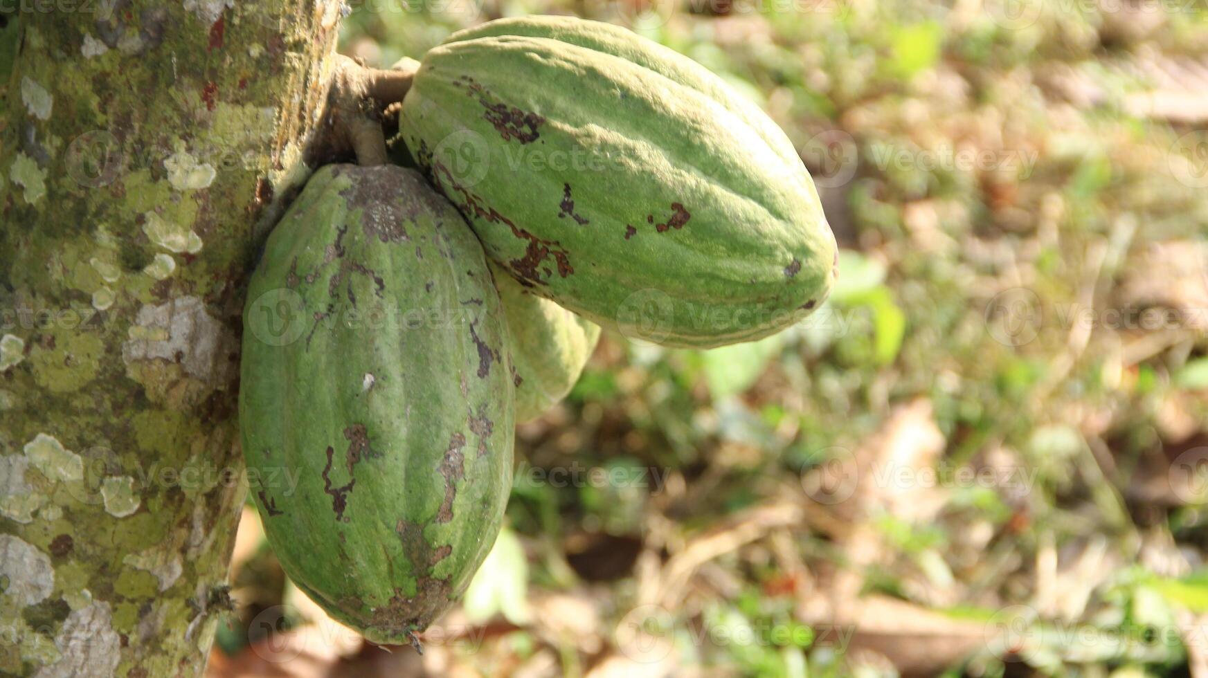 Bunch of young cocoa pods on a tree branch with close up view copy space Pro Photo
