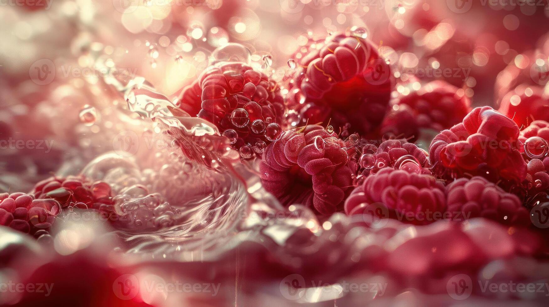 a close-up view of a vibrant red raspberry as it is submerged in water , creating a splash effect Pro Photo