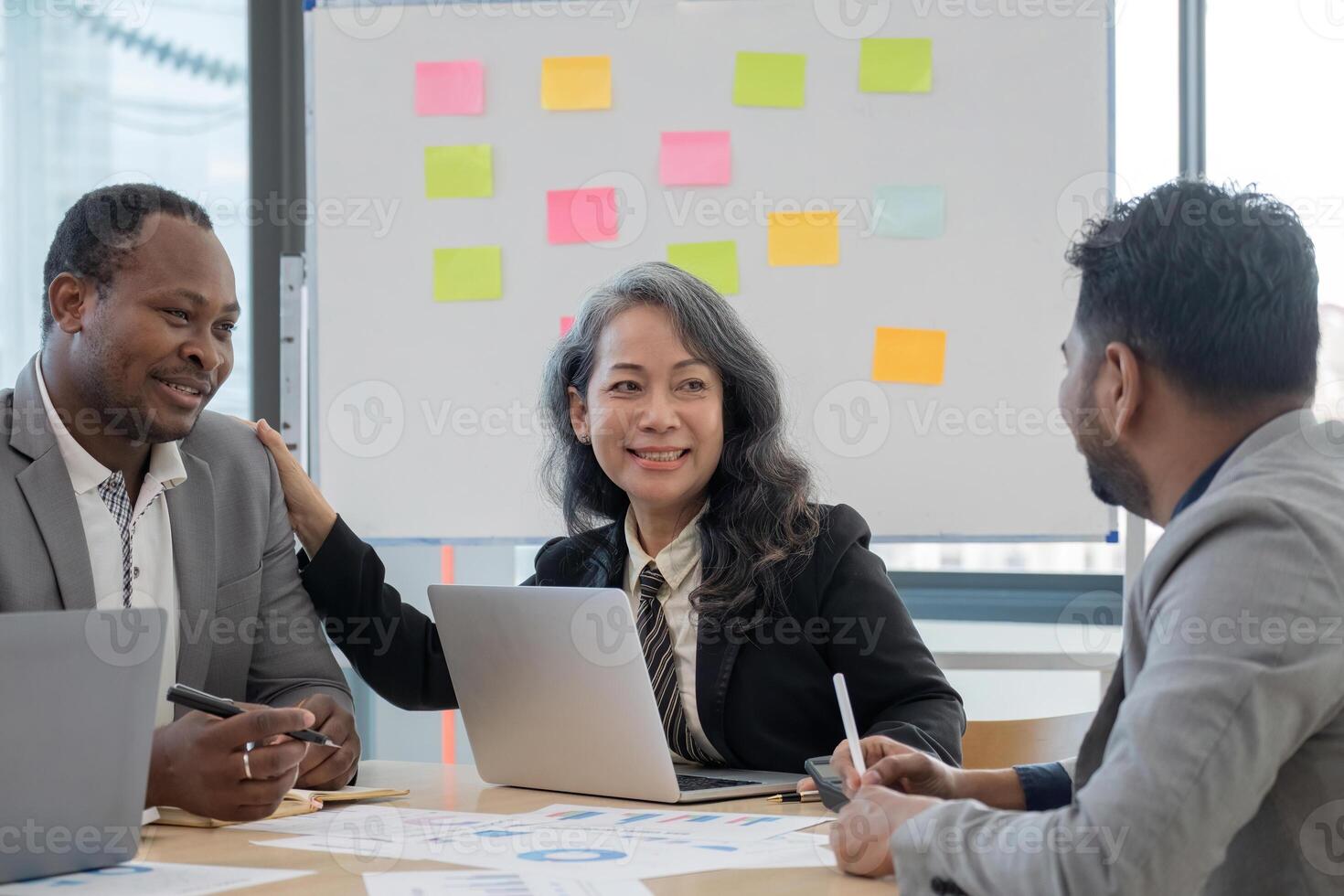 Diverse team different and data with sales strategy at office. Talk, collaboration and teamwork with brainstorming and paperwork analysis of finance with statistics Pro Photo