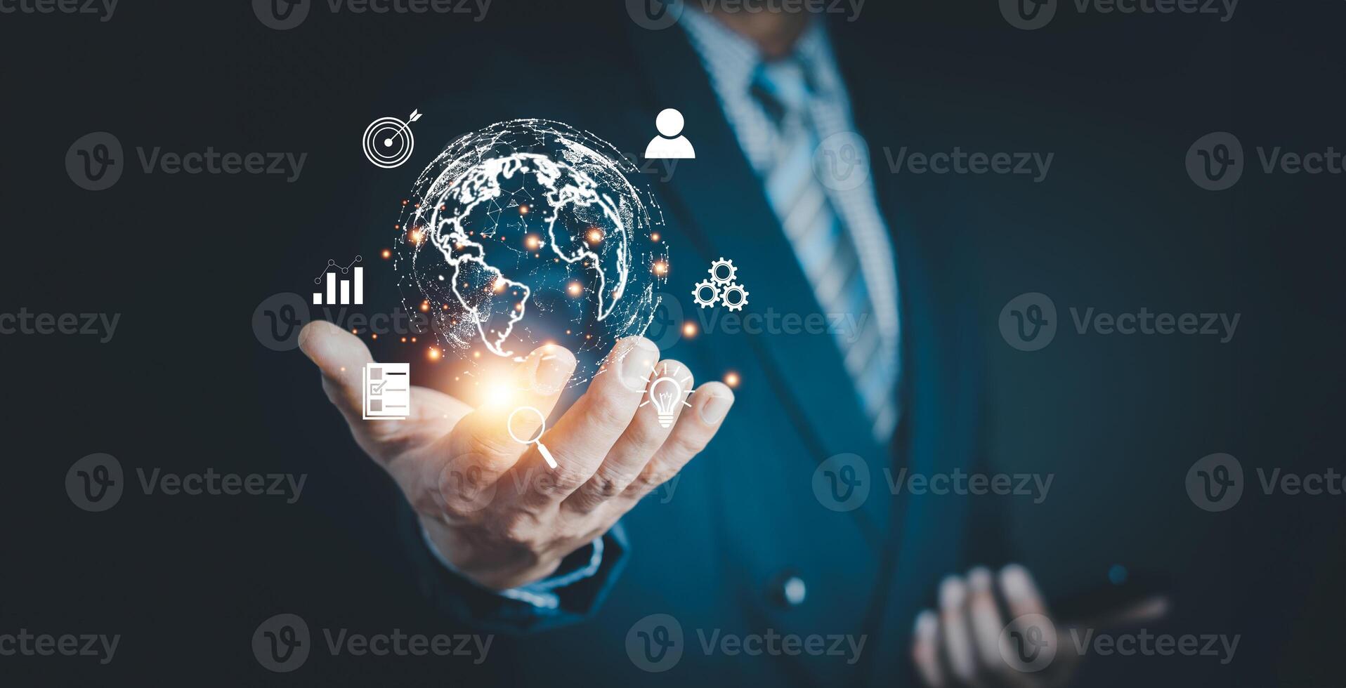Businessman holding global network connection on social networking and customer data analytics, Business strategy and smart intelligence, digital marketing, Technology and global business. Pro Photo