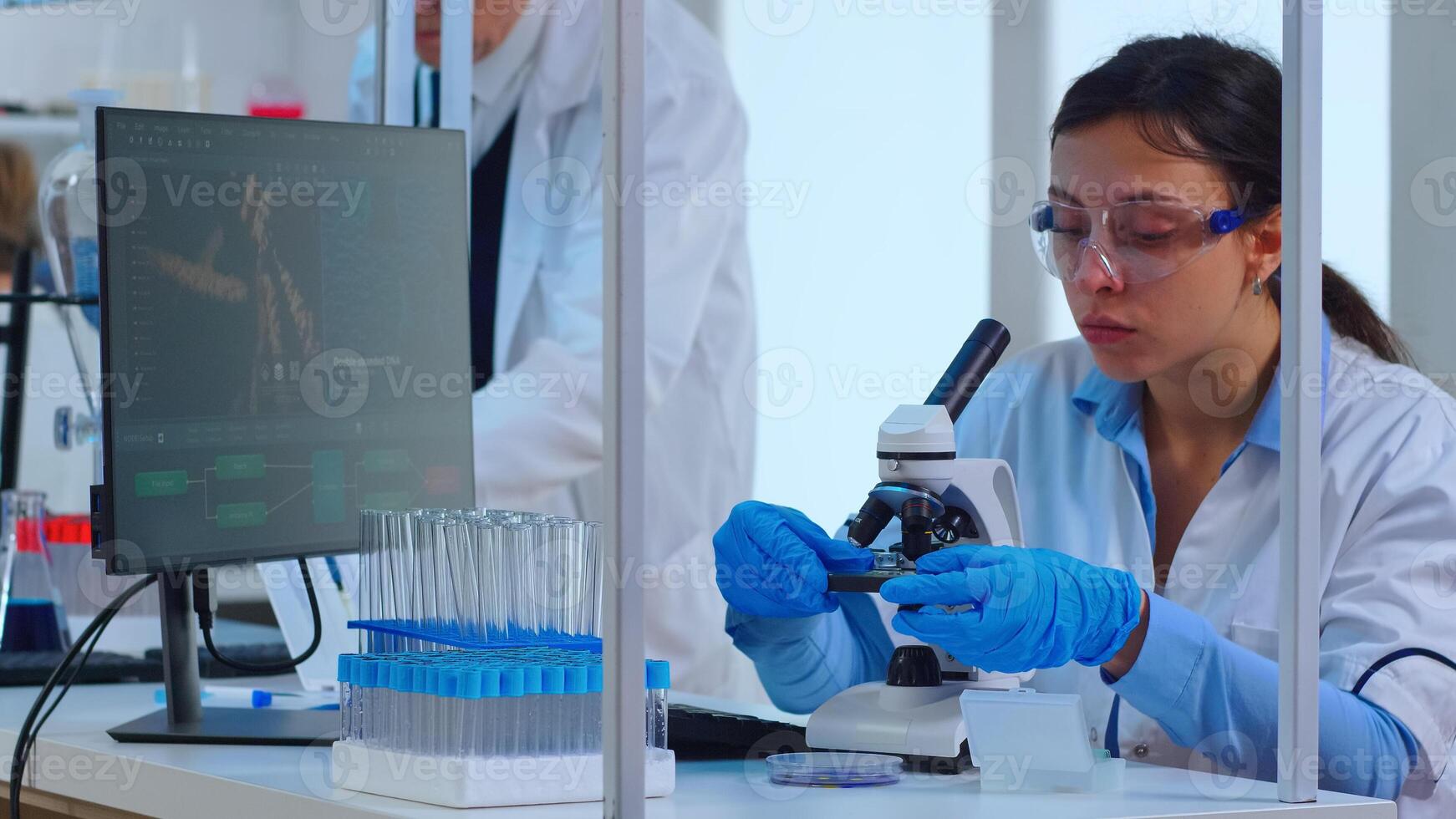 Scientist making research using microscope while colleagues working on background in modern equipped laboratory. Multiethnic stuff analysing vaccine evolution using high tech for researching treatment Pro Photo