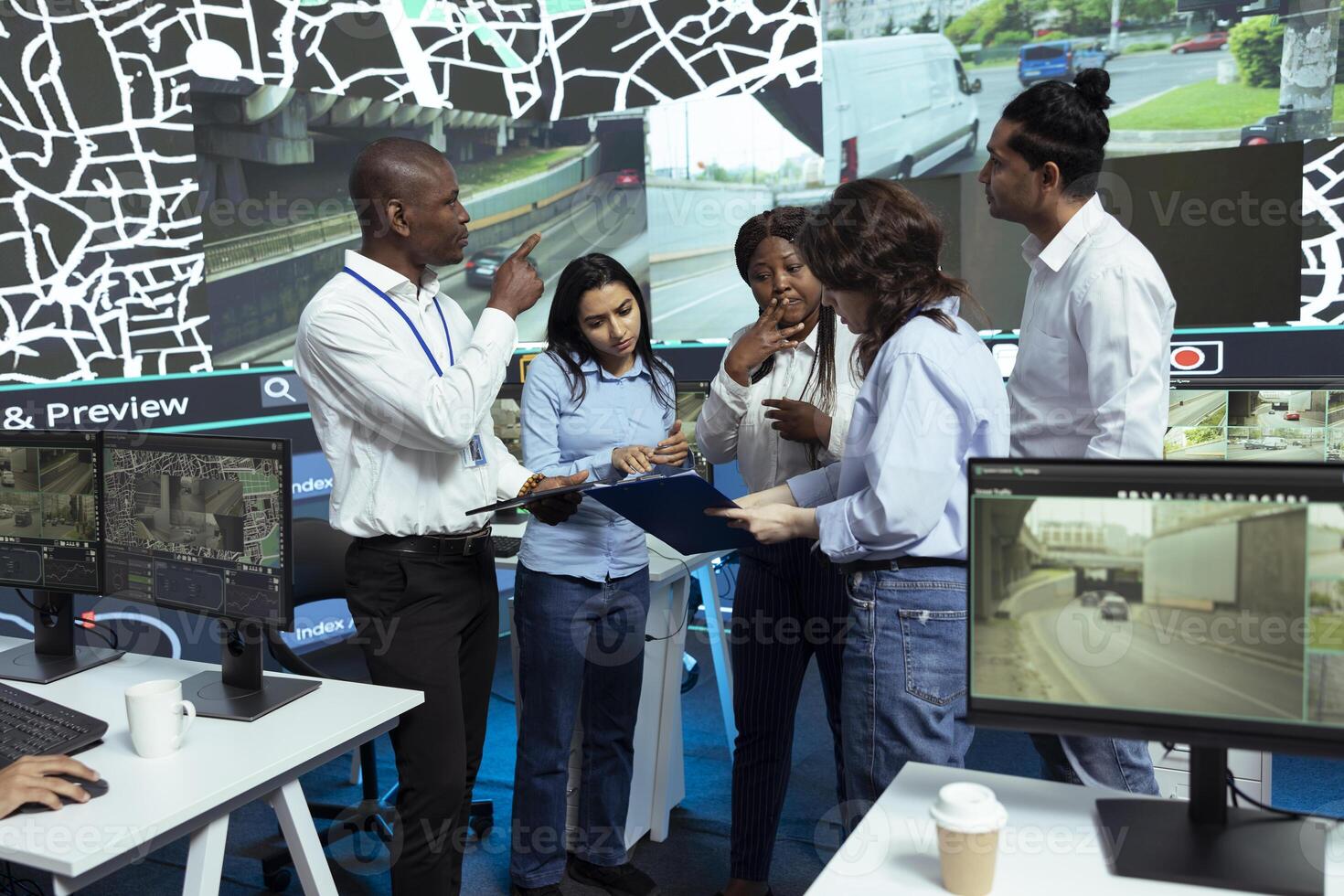 Diverse group of operators discussing ways to improve express shipping and delivery, tracking orders via gps coordinates and pin on satellite map. Gather insight on cargo logistics. Pro Photo