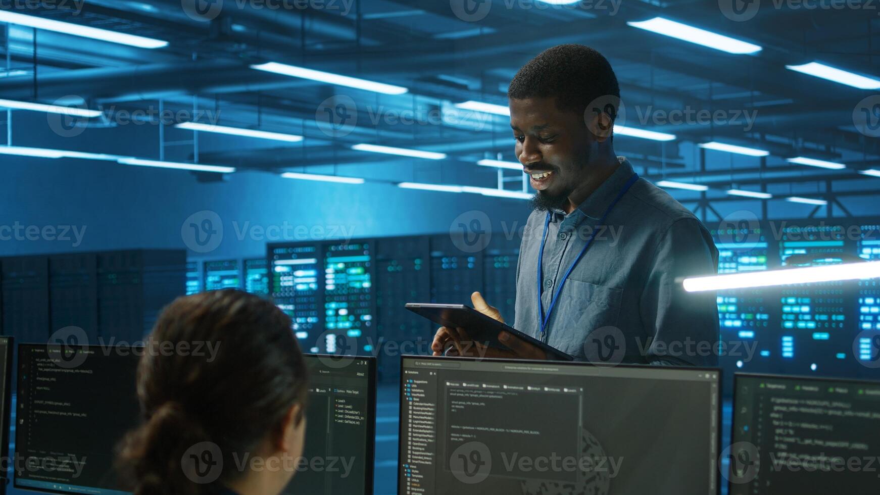 IT expert in server hub ensuring valuable data remains shielded from potential threats using tablet. Employee safeguarding data center against unauthorized access and vulnerabilities Pro Photo