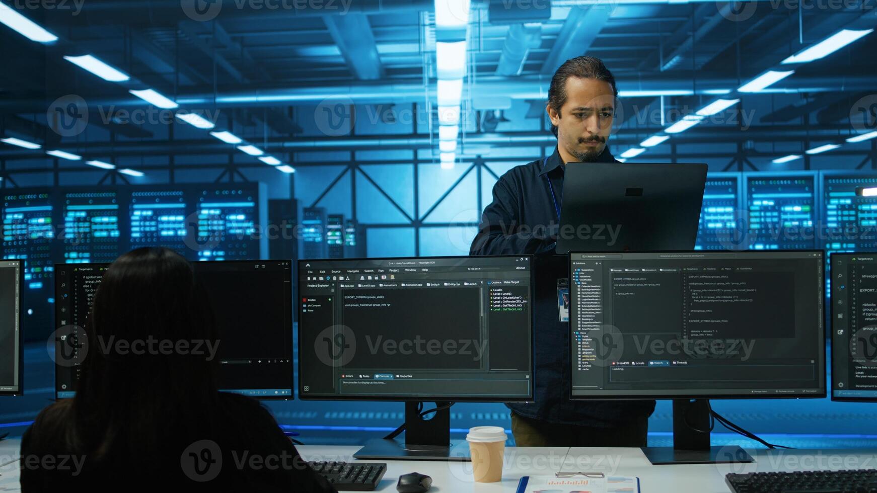 Smiling admin doing yearly checkup to prolong data center electronics life span and avoid downtime. Upbeat employee in server room monitoring server infrastructure components using laptop Pro Photo