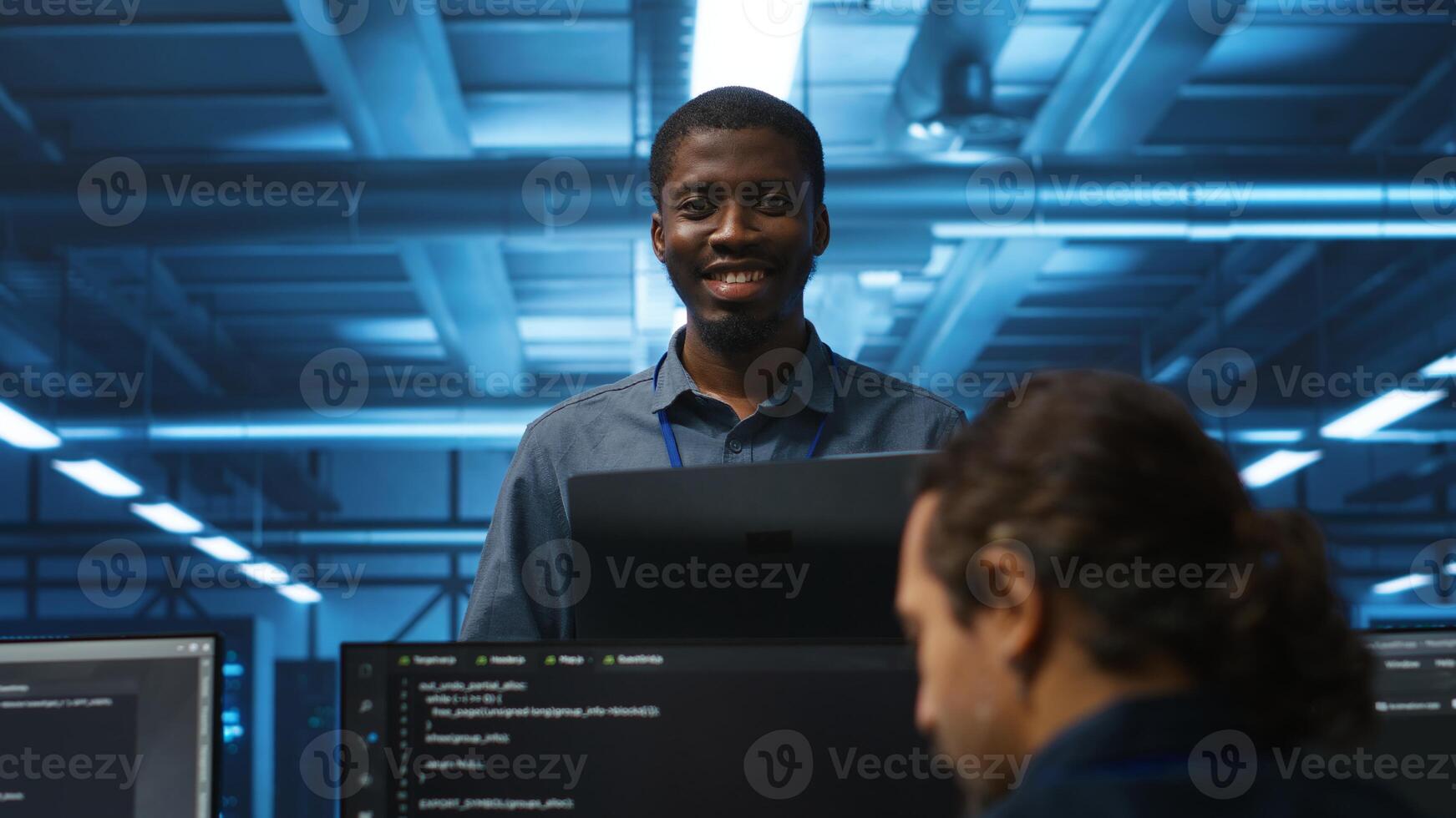 Portrait of cheerful african american manager supervising team in server room providing computing resources for workloads. Jolly supervisor oversees technicians in data center mending supercomputers Pro Photo