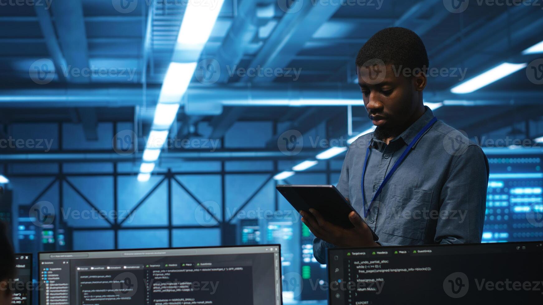 Technician in server hub using tablet to find hardware misconfigurations affecting rackmounts performance. Man checking data center infrastructure devices bottlenecks leading to errors Pro Photo