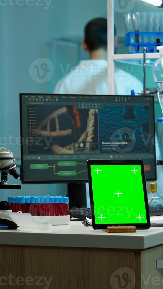Microbiologist working on monitor in background analysing test samples with tablet with green chroma key screen placed on desk in front. Team of biotechnology scientists developing drugs. Pro Photo
