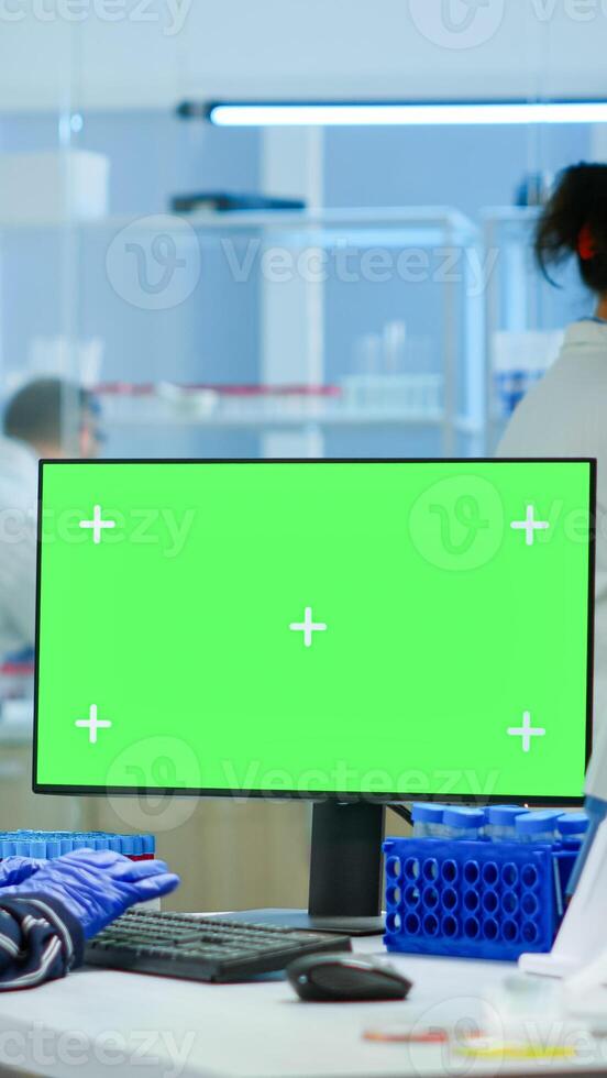 Medical research scientist working on pc with green screen mock up template in applied science laboratory. Engineers conducting experiments in background, examining vaccine evolution using high tech Pro Photo