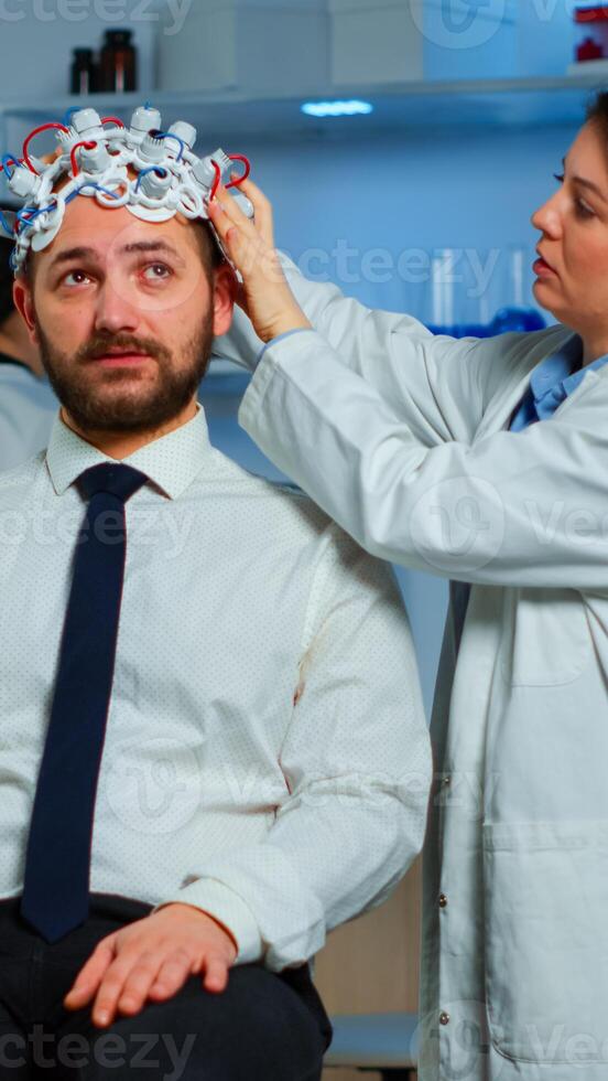 Woman researcher putting brainwave scanning headset to patient developing experiments using brain study lab monitors. Man siting on chair while scientist adjusting device examining nervous system Pro Photo