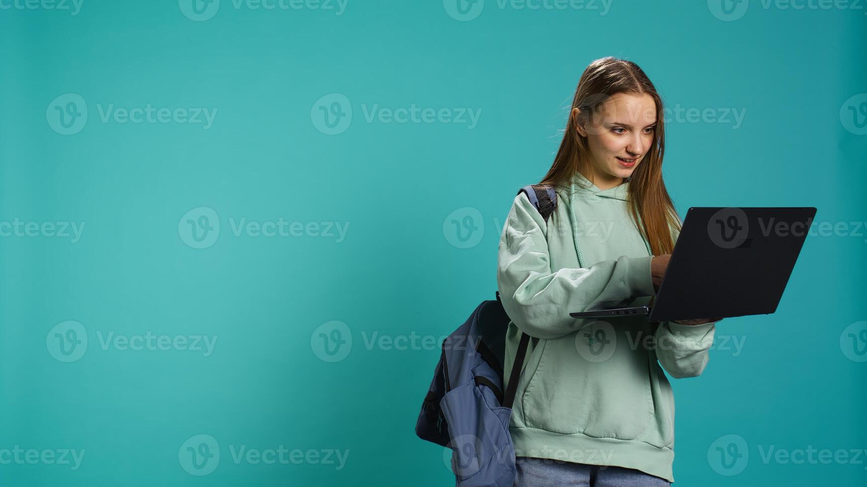 Joyful woman adding payment method on website using laptop, enjoying sales period, studio background. Girl doing purchases on internet, typing credit card information on notebook, camera B Pro Photo