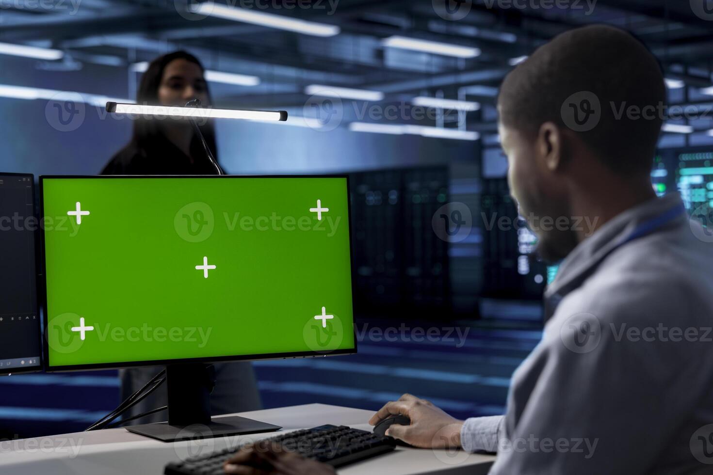 Technician using green screen desktop PC to oversee servers used for managing databases. African american man working on mockup computer monitor in data center storing information Pro Photo