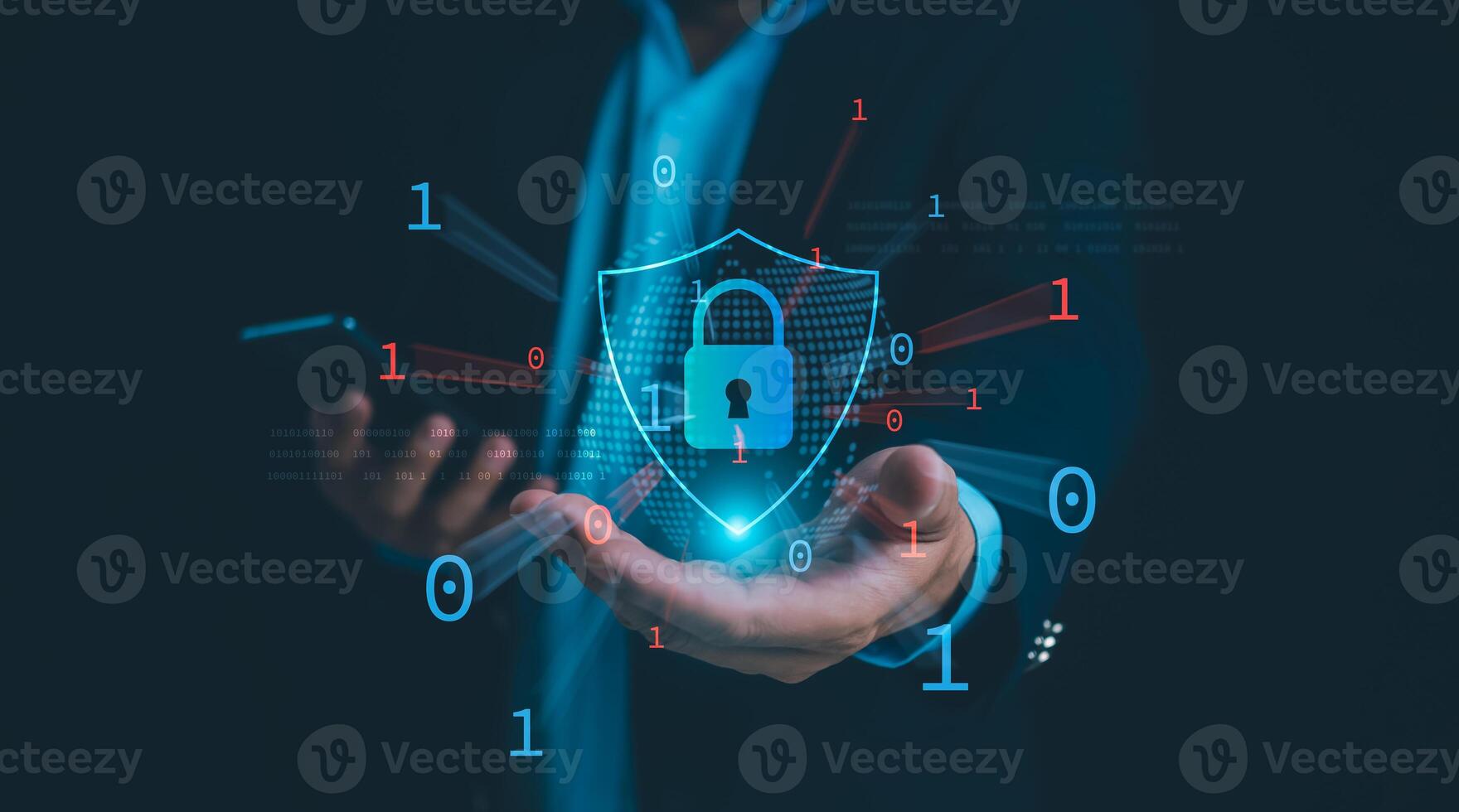 Businessman showing key and symbolic shield represents protection against cyber attacks and online hacking, Protection against external hacks, Cybersecurity and privacy concepts to protect data. Pro Photo