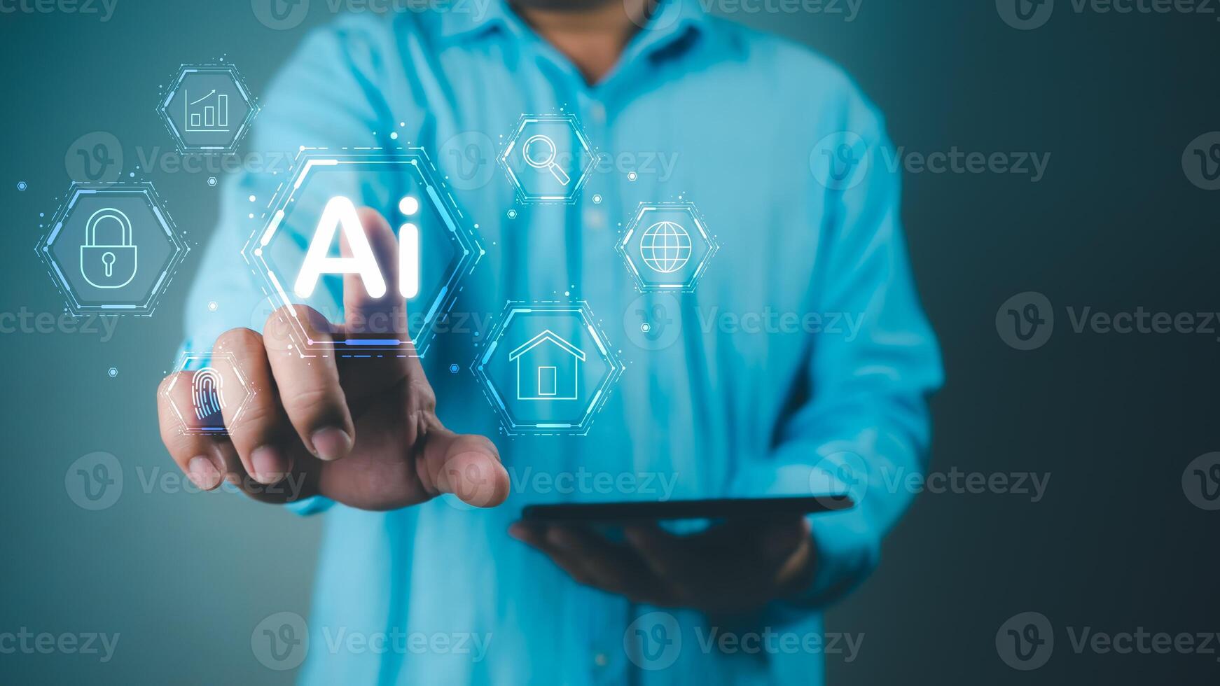 Businessman hand showing modern technology on internet network AI technology in everyday life, Concept of technology or using AI to help with work, Internet of Things, Artificial intelligence brain. Pro Photo