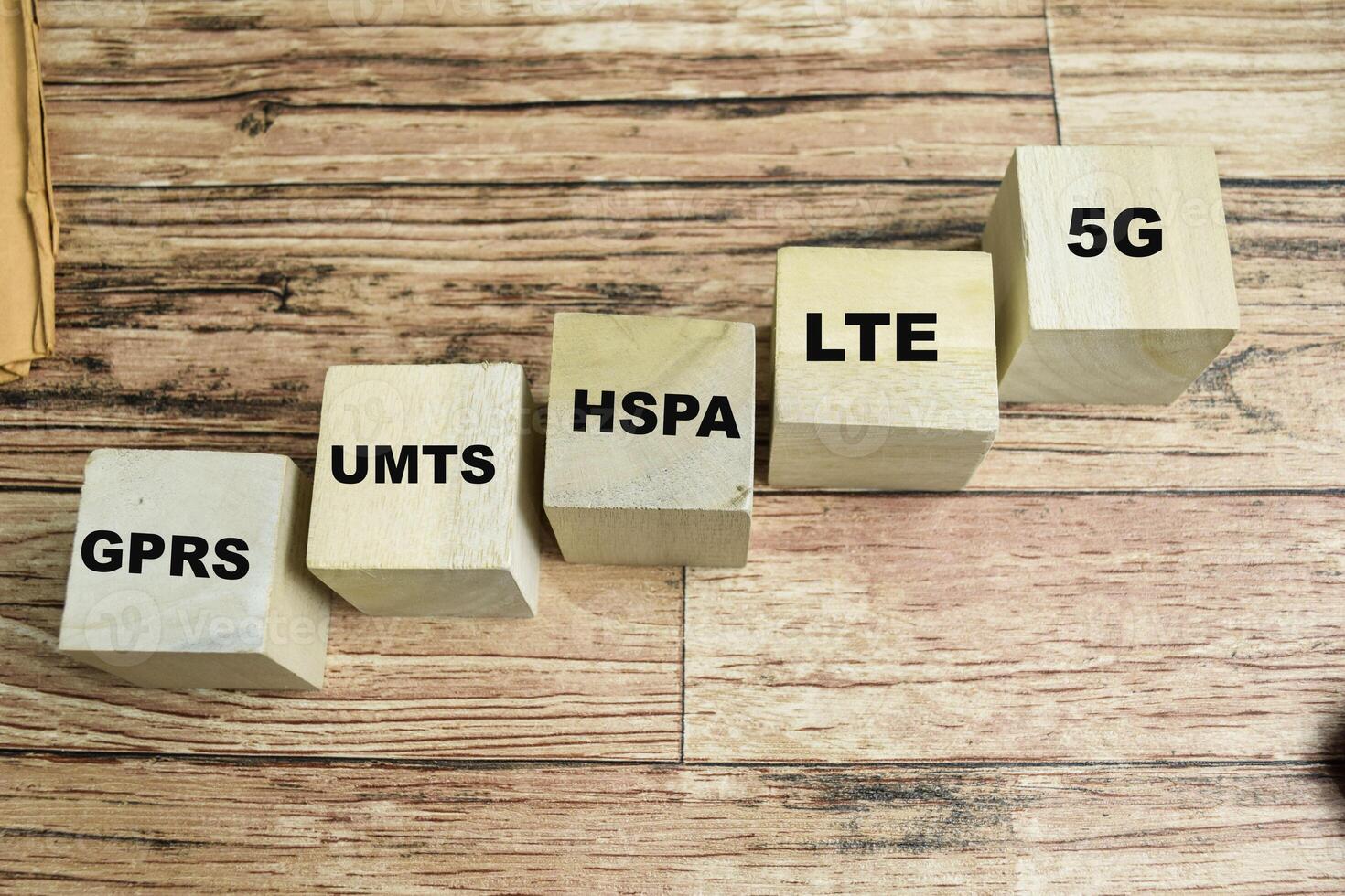 Concept of The wooden Cubes with the word etzabdeckung bandbreite 5g it means network coverage bandwidth 5G on wooden background. Pro Photo