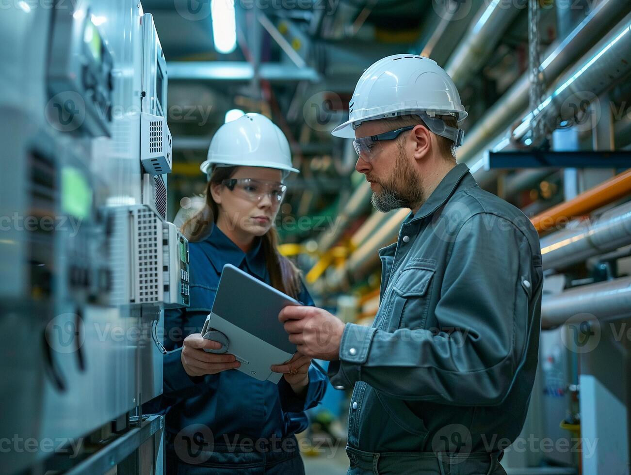 Technicians monitoring energy storage units in a production plant, implementing lepractices to boost efficiency Pro Photo