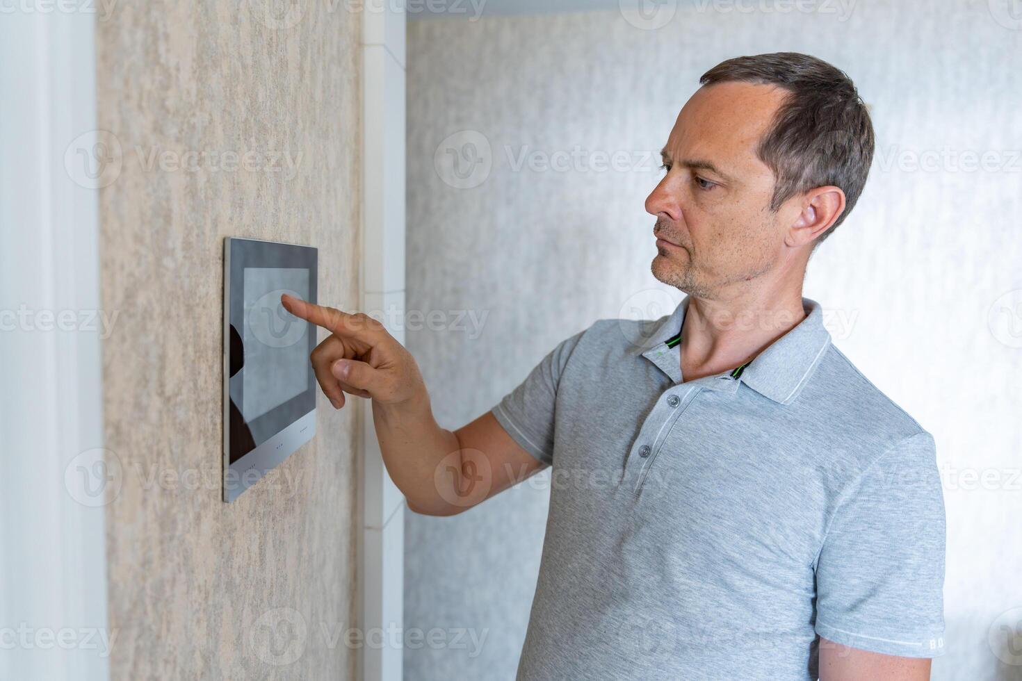 Man using tablet panel application for control smart home living. Wireless device controller for home automation IoT on the wall. High quality photo Pro Photo