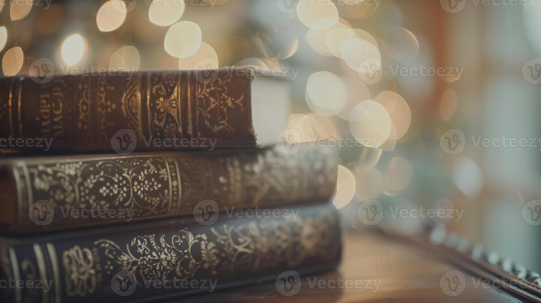 Softly defocused background of closed books adorned with delicate ornate designs that create a dreamy bokeh effect. The faded motifs add a sense of history and intrigue to the imagery. Pro Photo