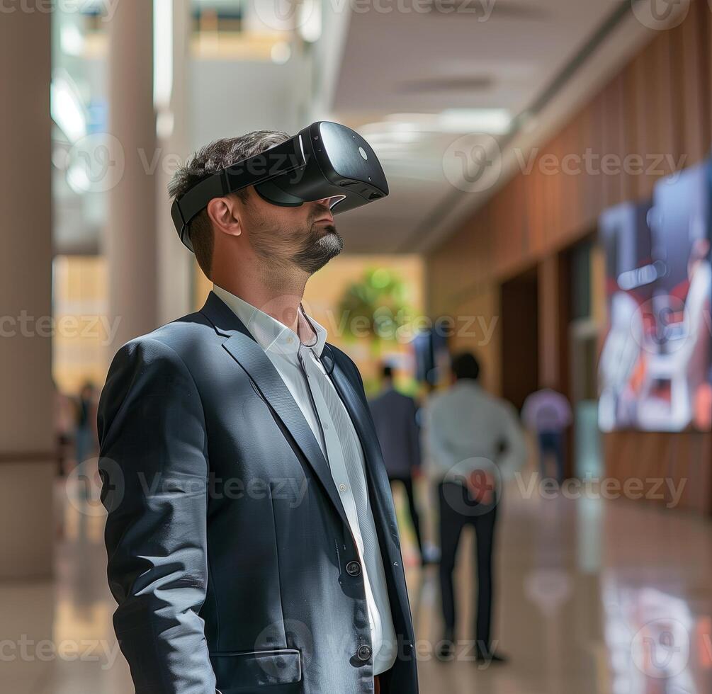 Man using VR headset, business technology in virtual reality, digital device for tech innovation. Pro Photo