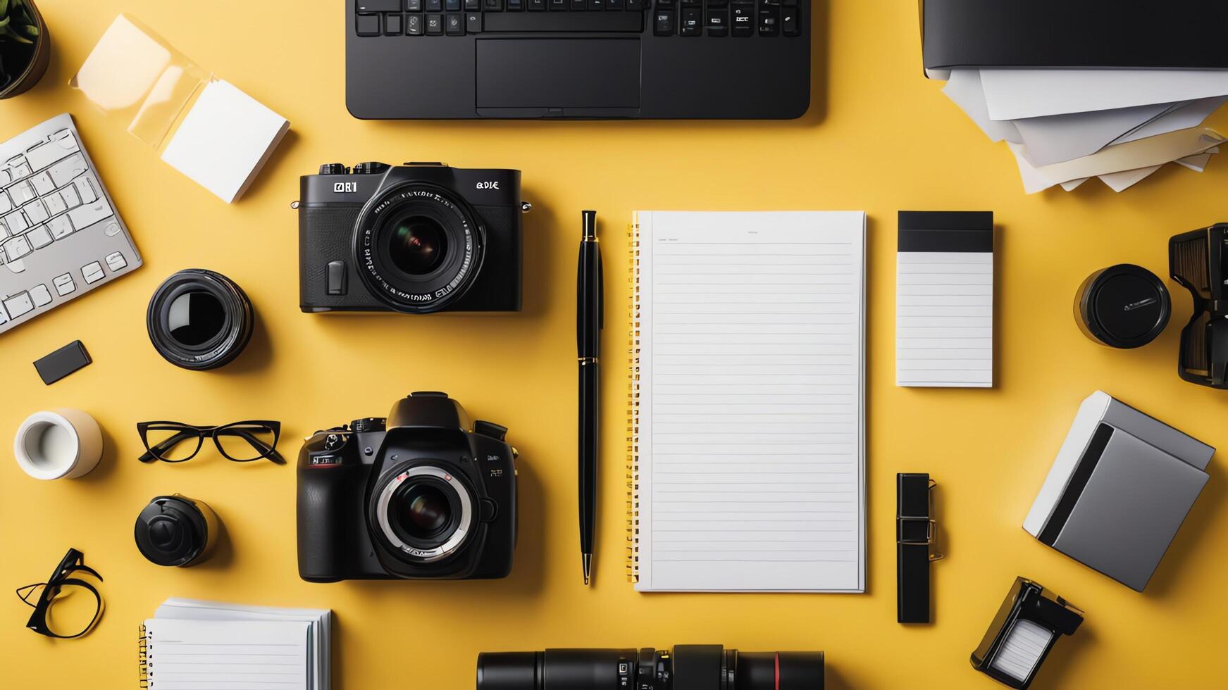 items on yellow table, background design of random objects on table photo