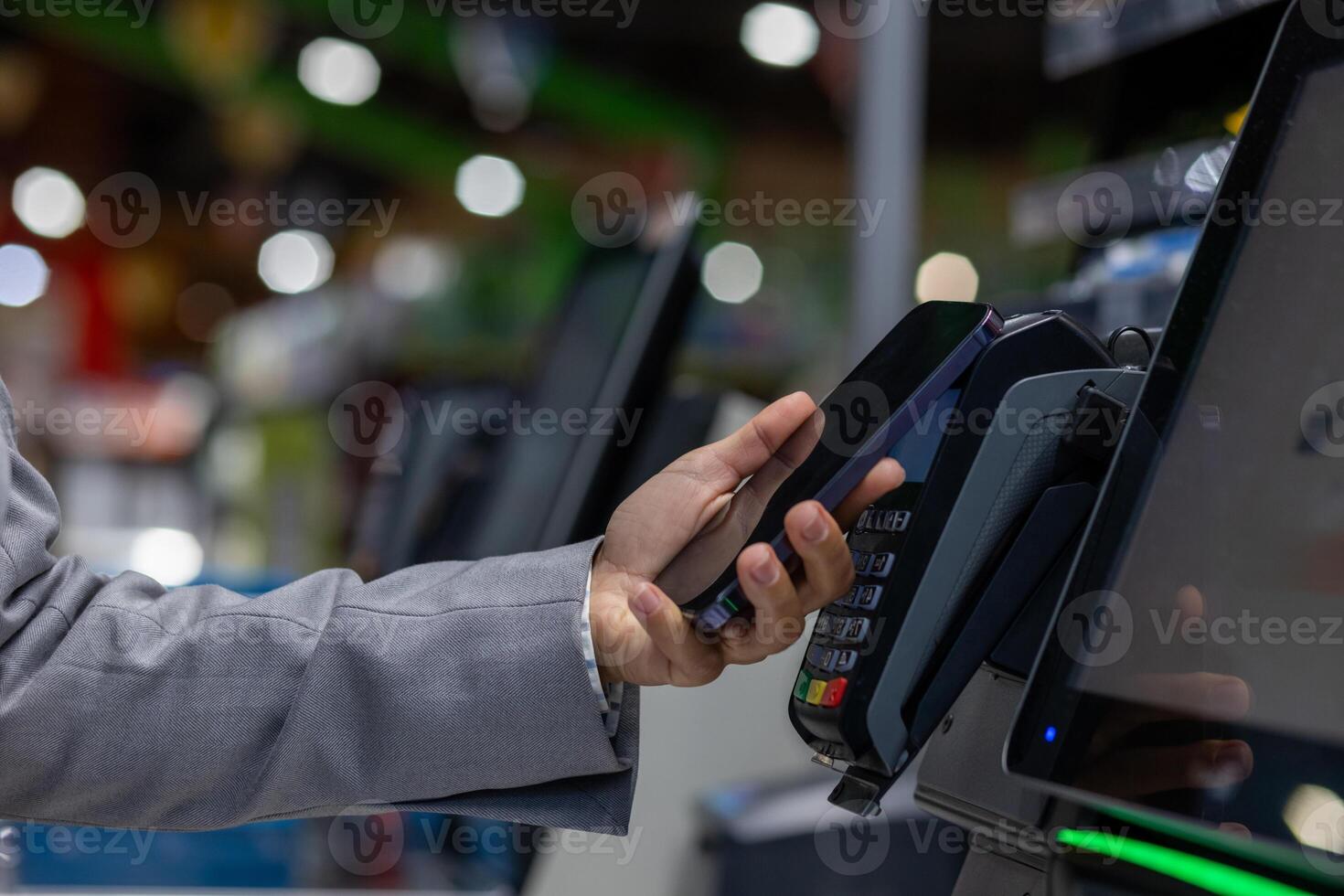 Image shows a person using a smartphone for NFC , Near Field Communication mobile payment on a point-of-sale terminal in a retail environment. The focus is on the technology and convenience. Pro Photo