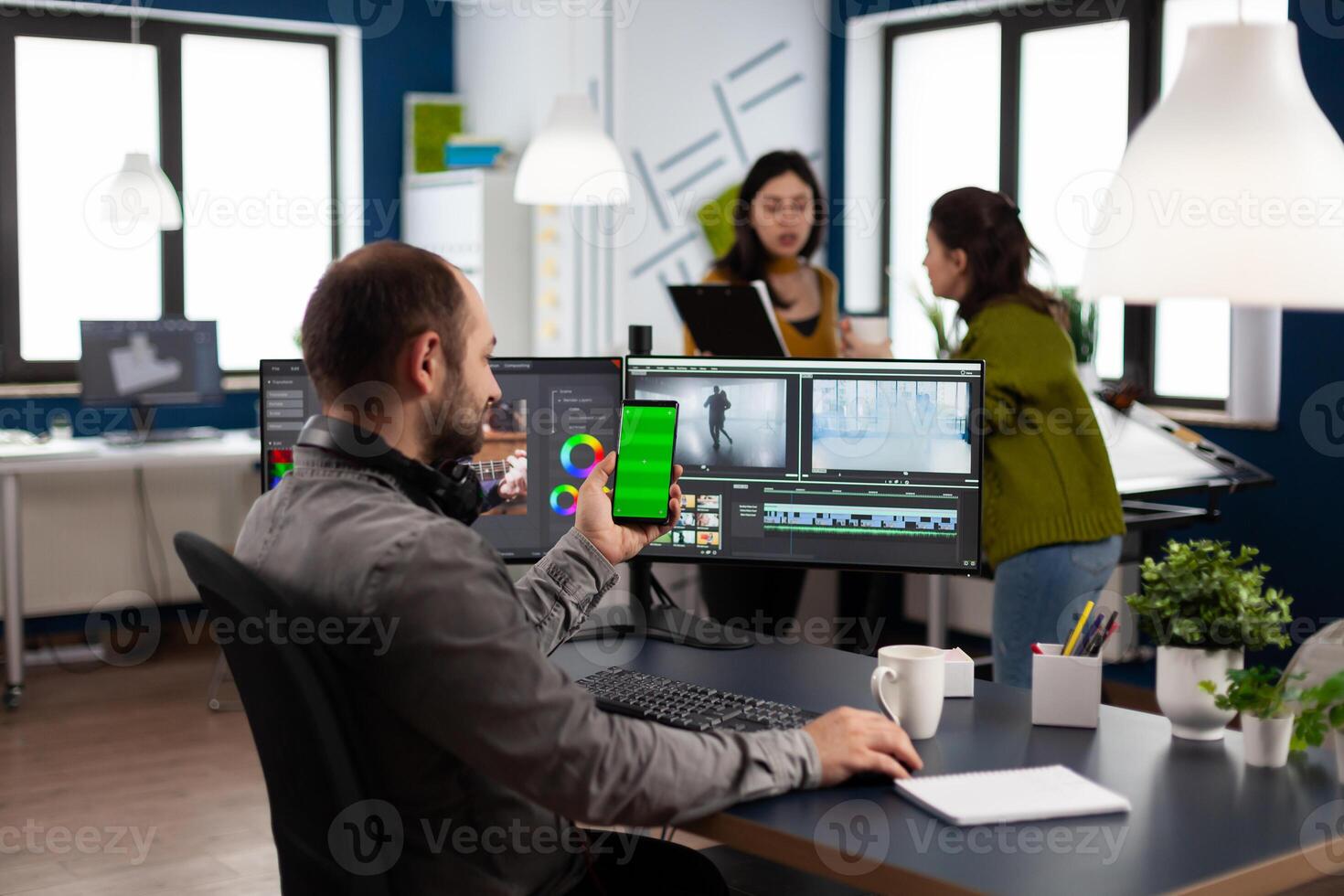 editor talking on call holding smartphone with green screen, chroma key mock up isolated display taking break from retouching movie sitting in start up office. Team working in background Pro Photo
