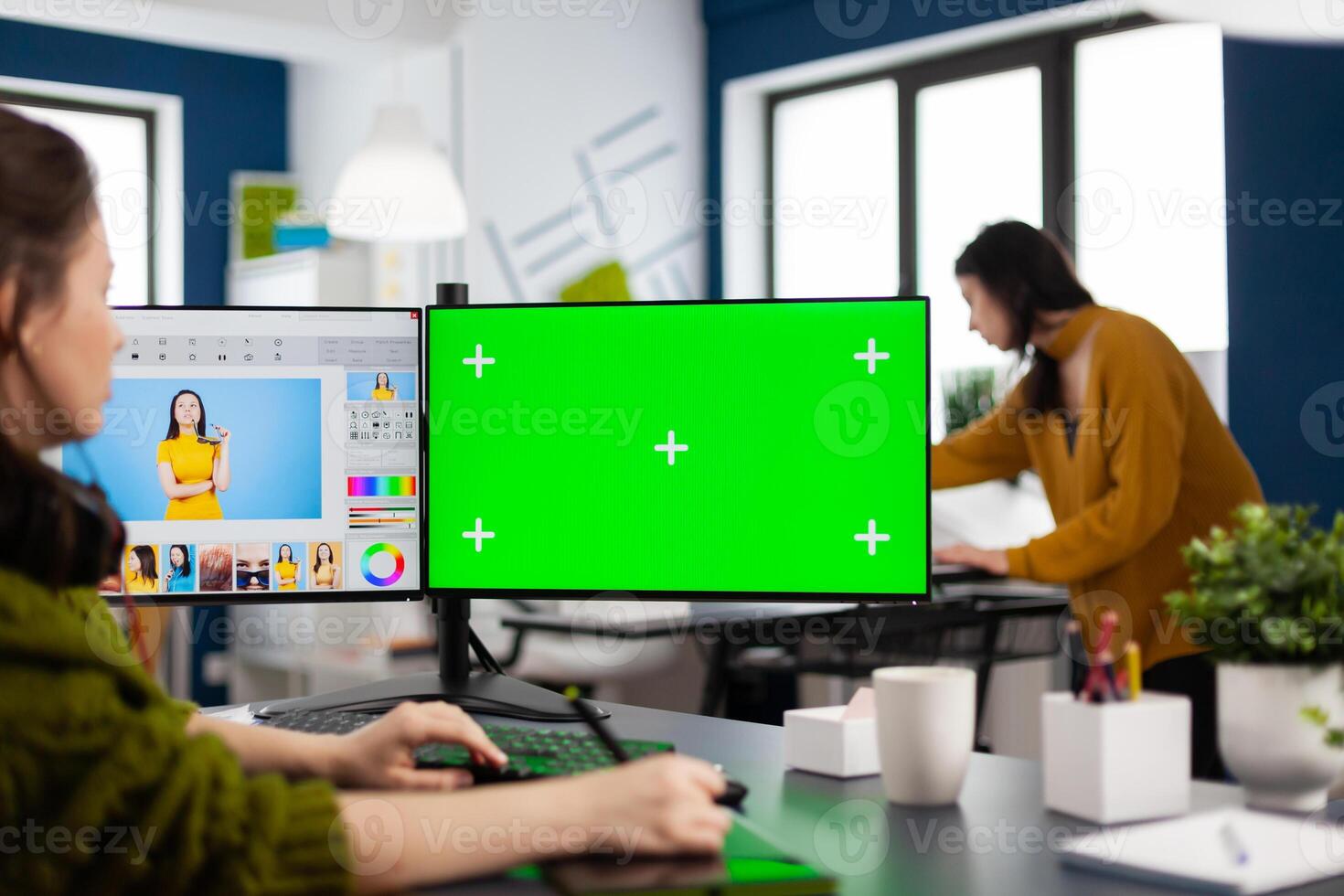 Creative woman retoucher editing assets in digital retouching program, working concentrated in photo production studio looking in computer with green screen, chroma key mockup isolated display. Pro Photo