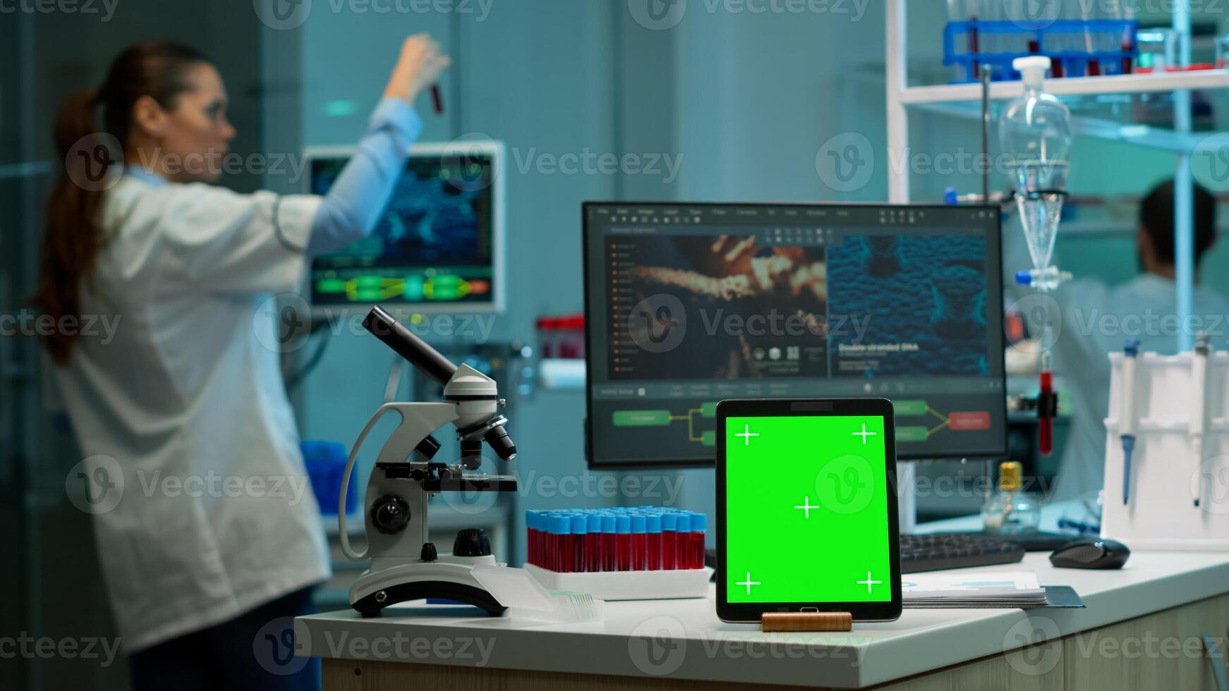 Team of scientists working in background of modern laboratory using tablet with green screen, mockup display, isolated chroma key monitor, analysing experiment evolution, high tech development lab. Pro Photo