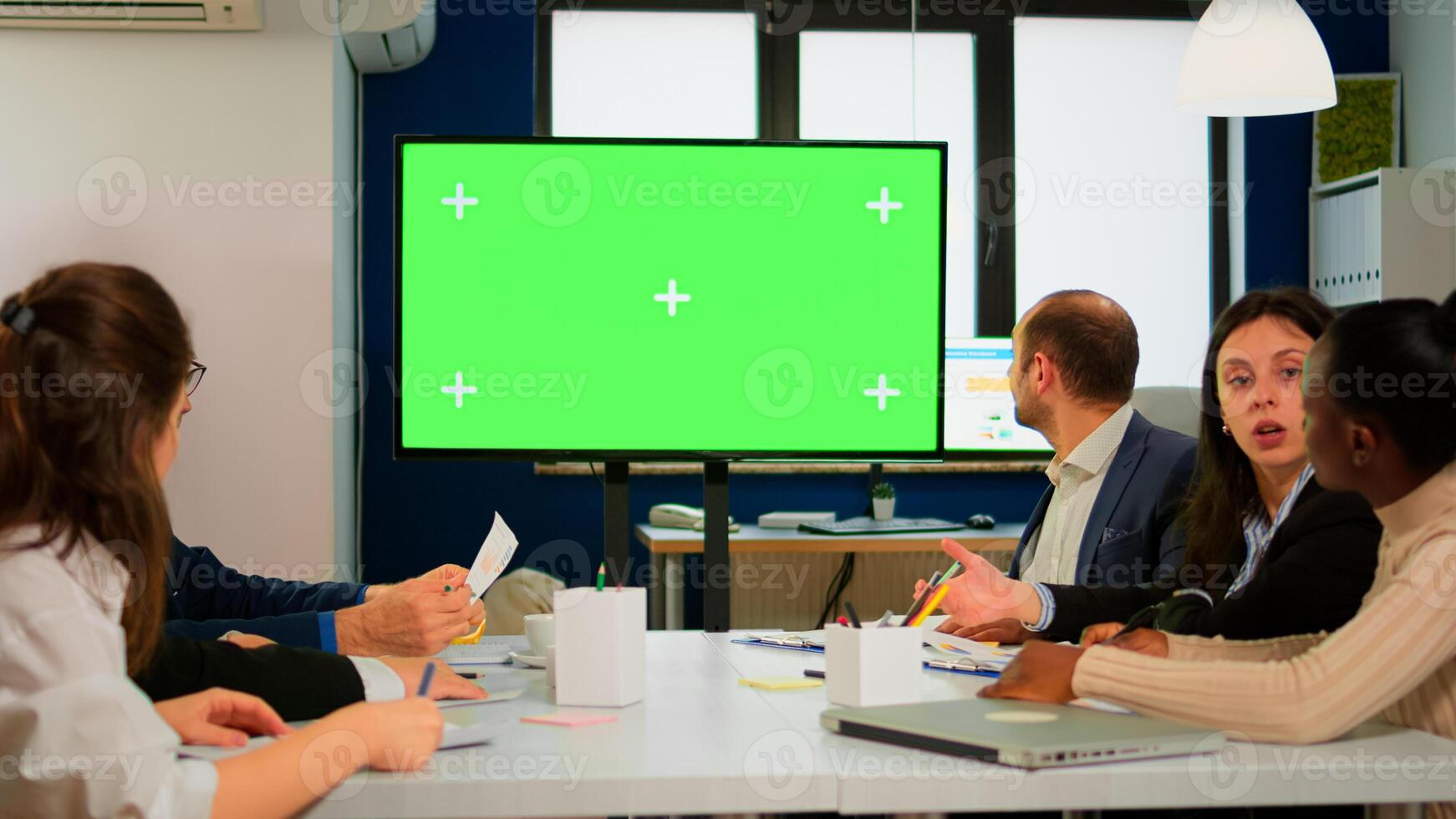 Group of business people discussing company plan with mockup tv green screen in front of desk, ready for financial project presentation. Multiethnic team using mock up monitor with chroma key display Pro Photo