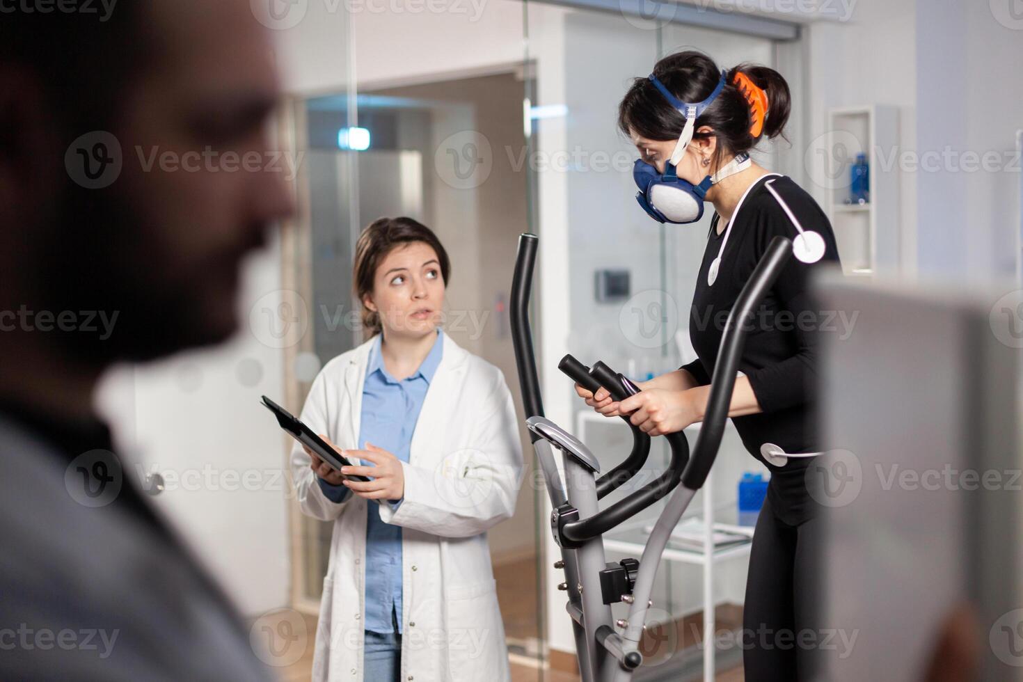 Sportswoman running with mask on cross trainer with electrodes attached to body. Physician using tablet computer and controls EKG data showing on laboratory monitors, discussing with patient. Pro Photo