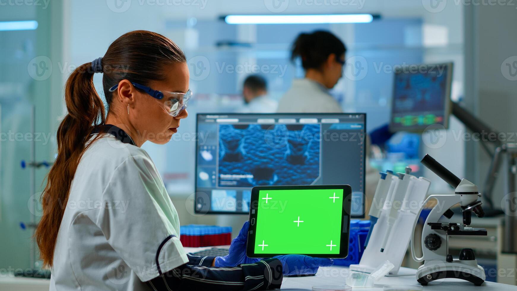 Medical research scientist working on tablet with green screen mock up template in applied science lab. Engineers conducting experiments in background, examining vaccine evolution using high tech Pro Photo