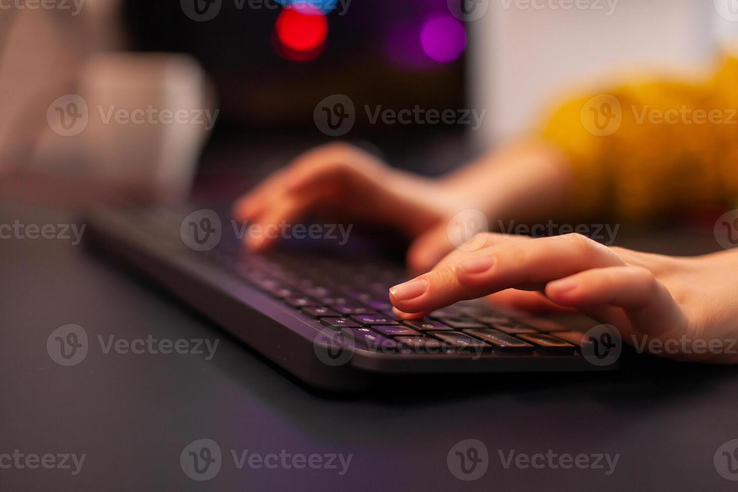 Close-up on hands of woman gamer playing game using keyboard. Virtual championship in cyberspace, esports player performing on pc during gaming tournament using technology network wireless. Pro Photo