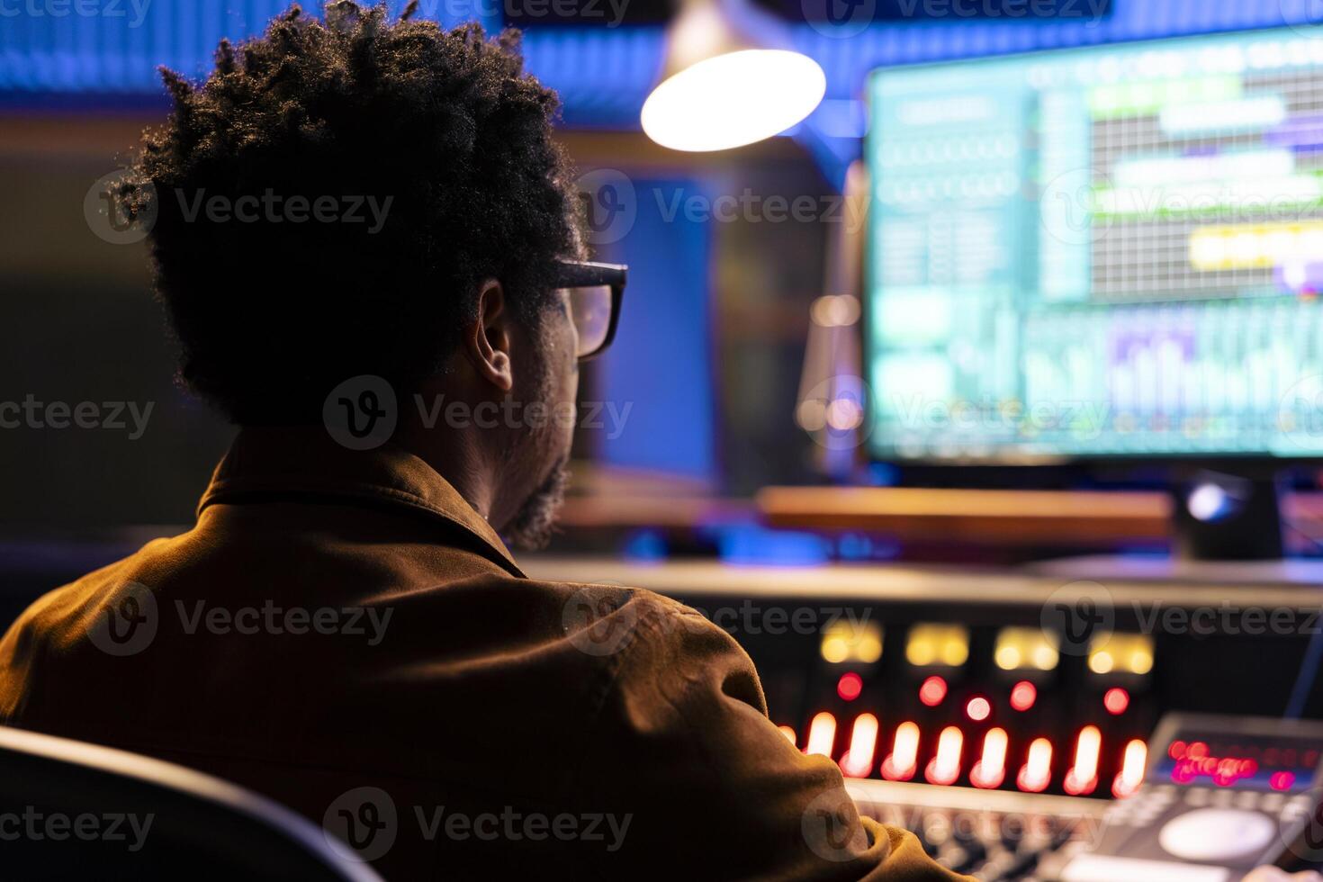 African american record producer mixing and mastering tracks with digital software, working with motorized faders and knobs to adjust sound settings. Audio engineer producing new music. Pro Photo