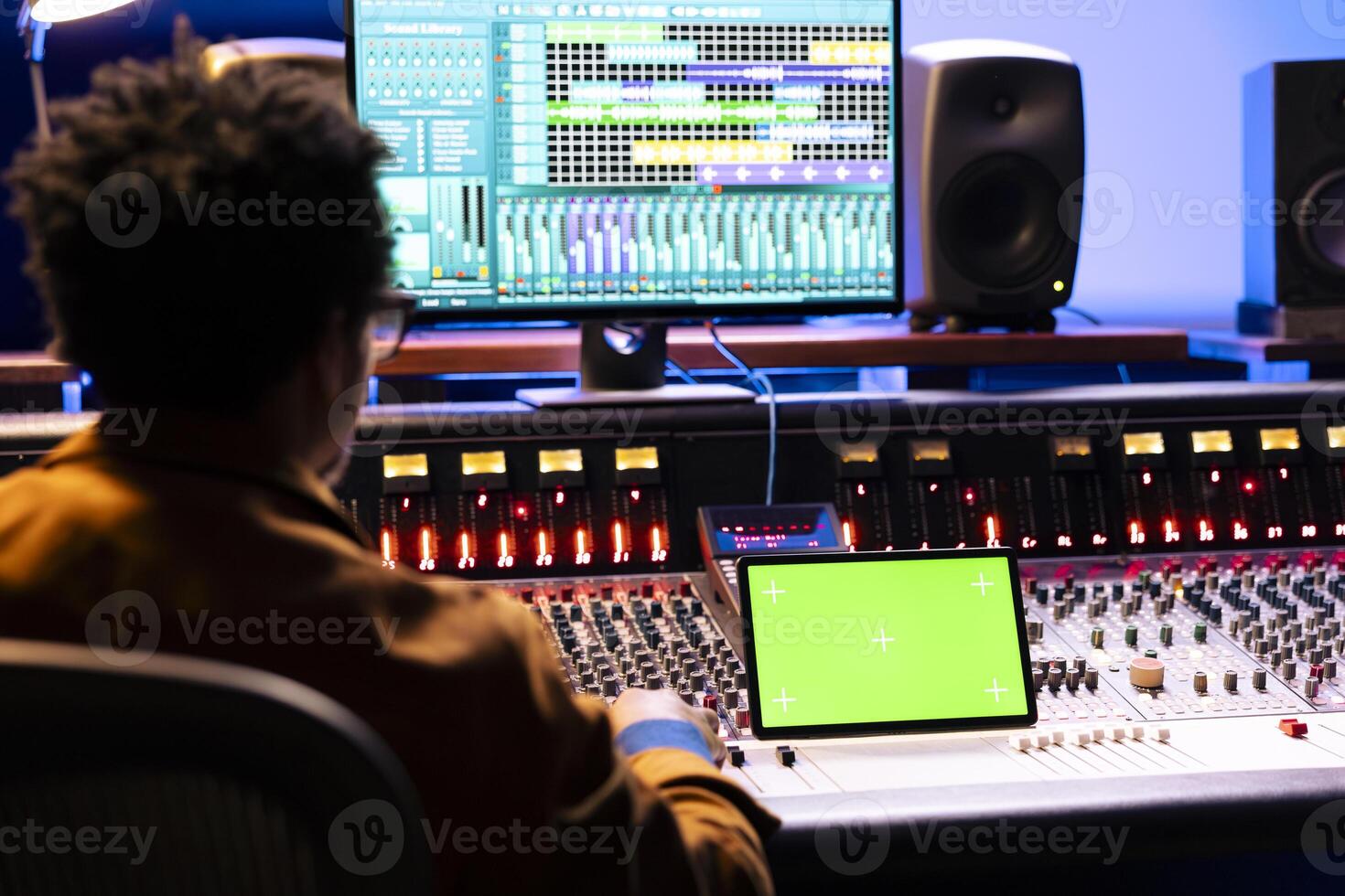 African american audio engineer looks at greenscreen on device and digital editing software on computer, processing music in studio. Sound producer creating tracks and adjusting volume levels. Pro Photo