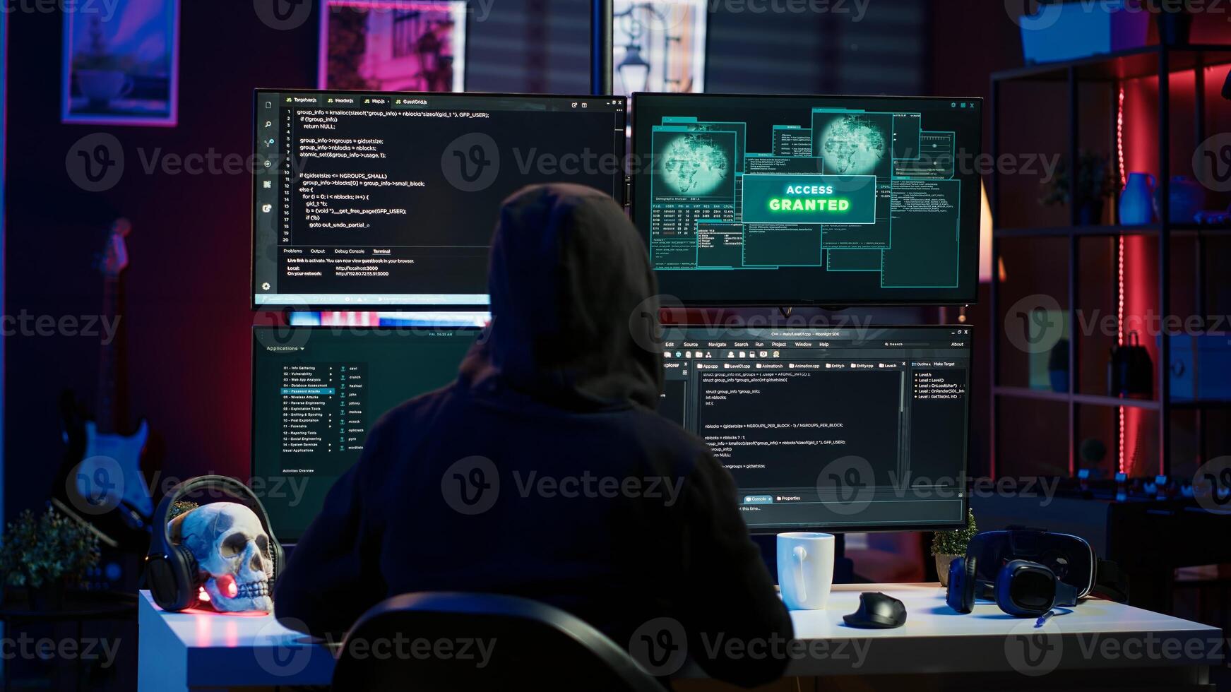 Happy man writing code on PC, celebrating after managing to get past security systems. Hacker using computer to make scripts that can hack devices, feeling proud after breaching firewall, camera A Pro Photo