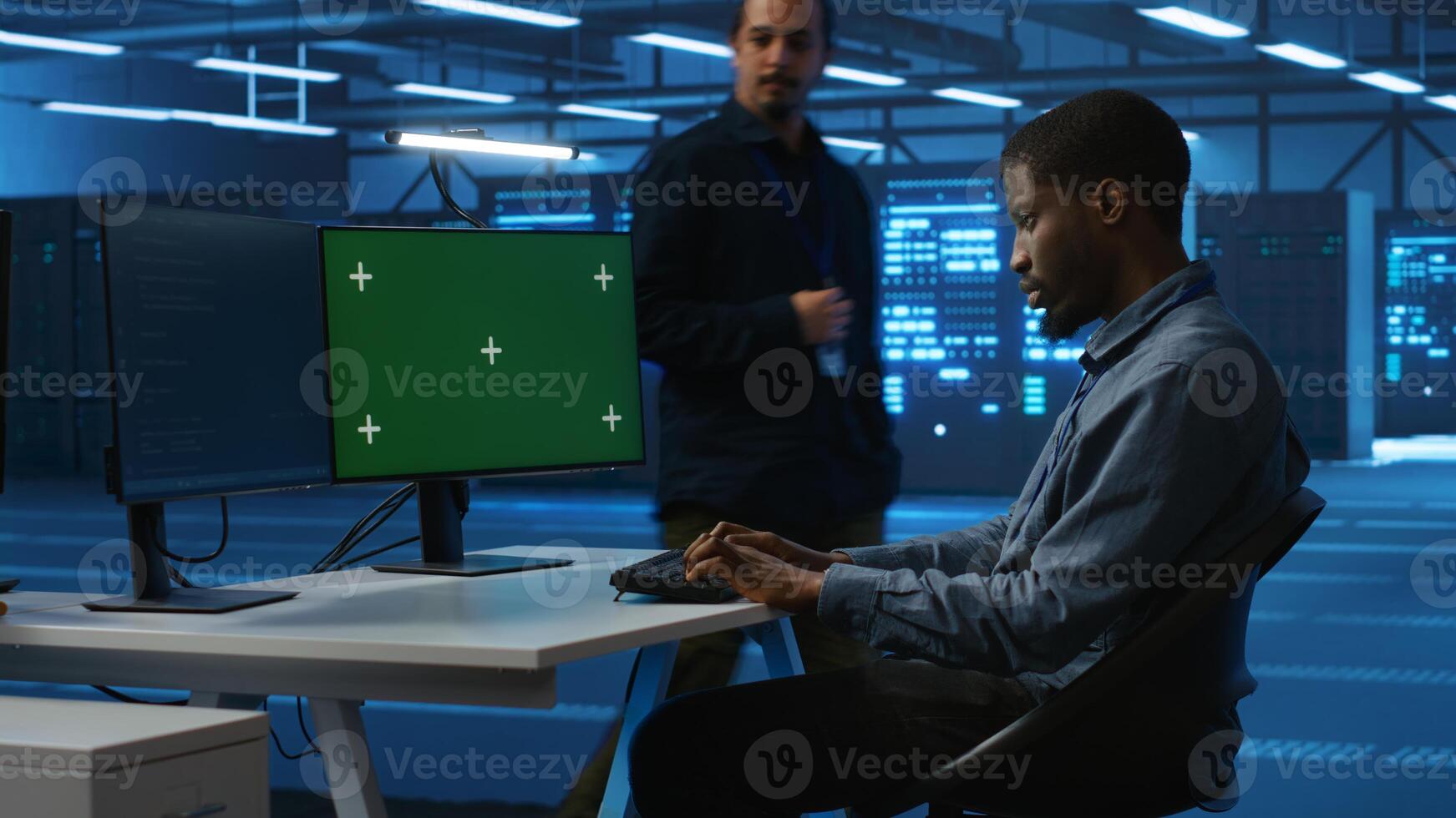 Technician upgrading equipment in data center using isolated screen display. Professional at PC desk in high tech establishment overseeing server rows with chroma key monitor, panning shot Pro Photo