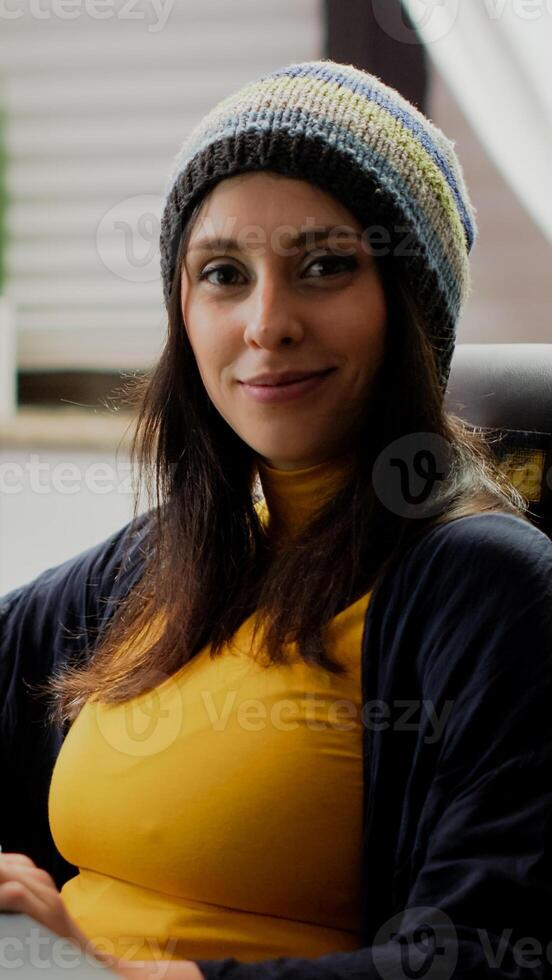 Woman looking at camera sitting in front of RGB powerful computer playing online space shooter videogame streaming game on internet. Pro cyber videogamer playing games in gaming home studio Pro Photo