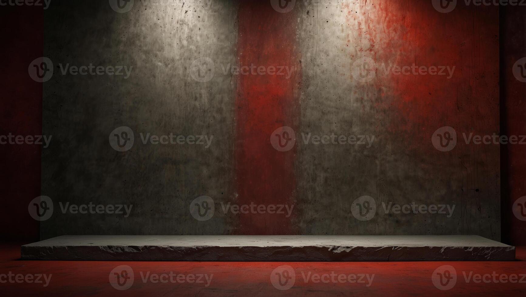 Empty Red old textured background and stand display or shelf with studio for showing or design christmas concept Blank backdrop made from cement material. Pro Photo