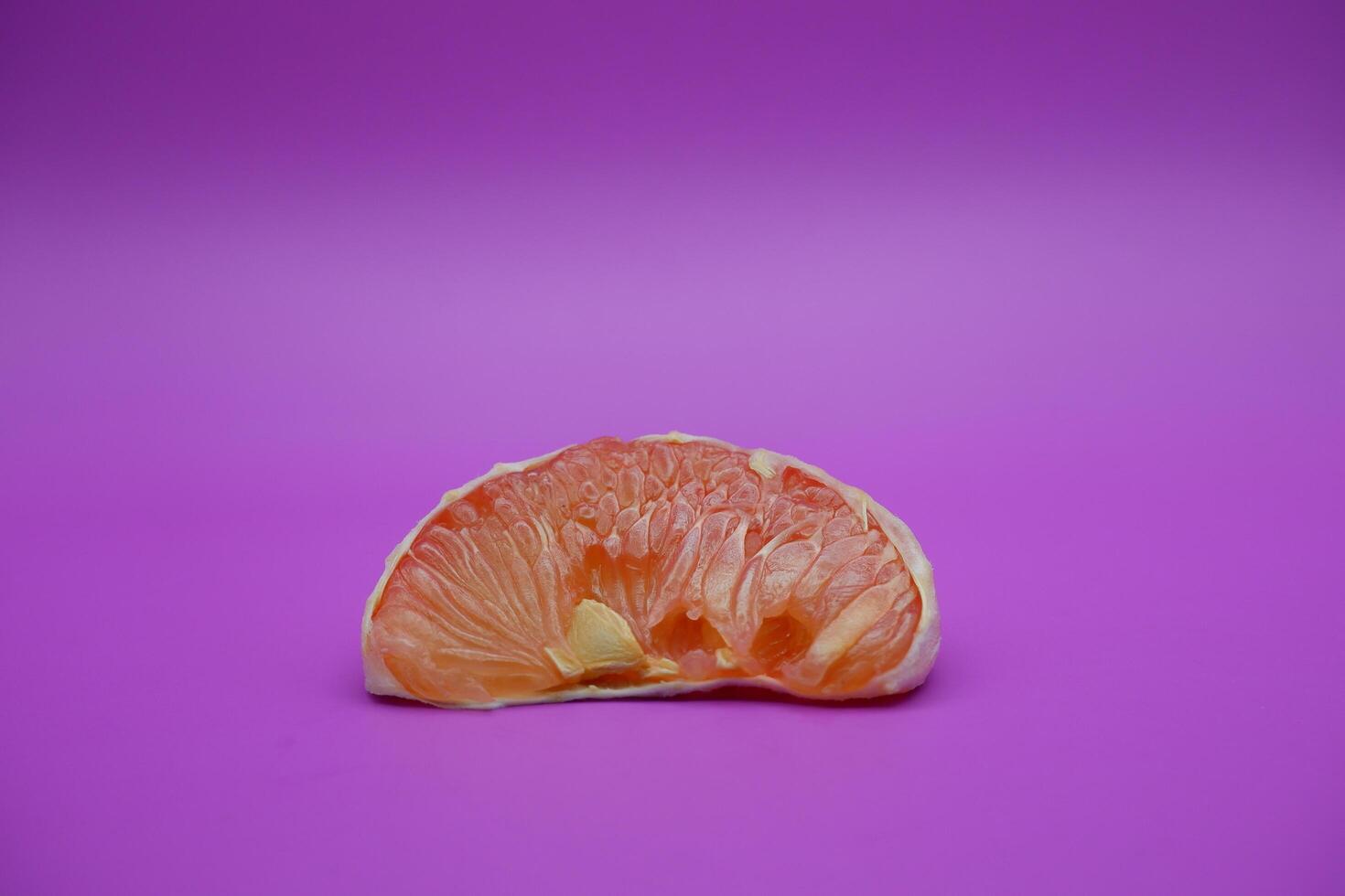 a slice of grapefruit isolated on a purple background. grapefruit that has been peeled until the grain of the orange is visible photo