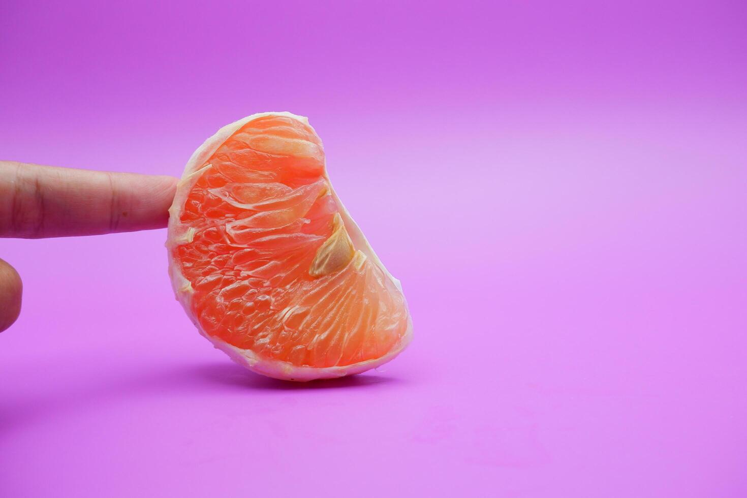 a slice of grapefruit isolated on a purple background. grapefruit that has been peeled until the grain of the orange is visible photo