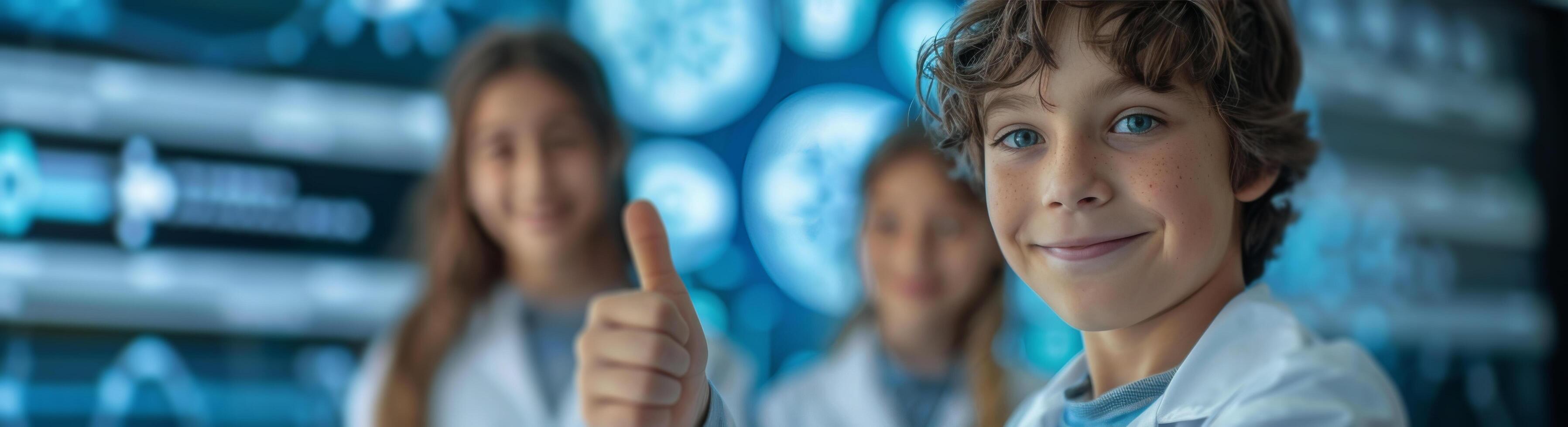 Smiling Boy Interacts With Interactive Digital Display In Futuristic Classroom photo